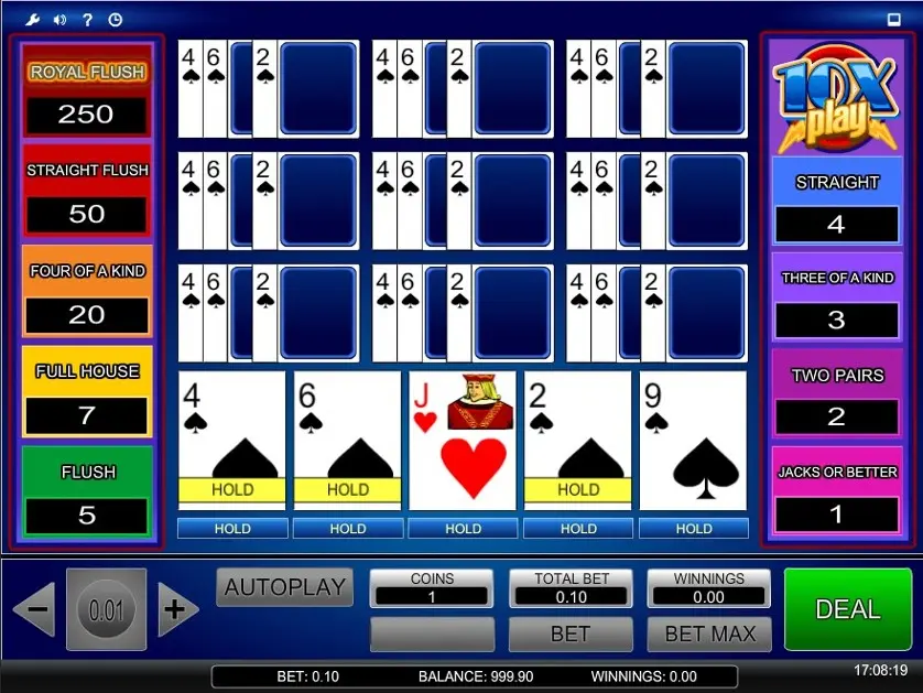 10x Play è un gioco di video poker di iSoftBet. Qui sopra, puoi giocare gratis in modalità demo.