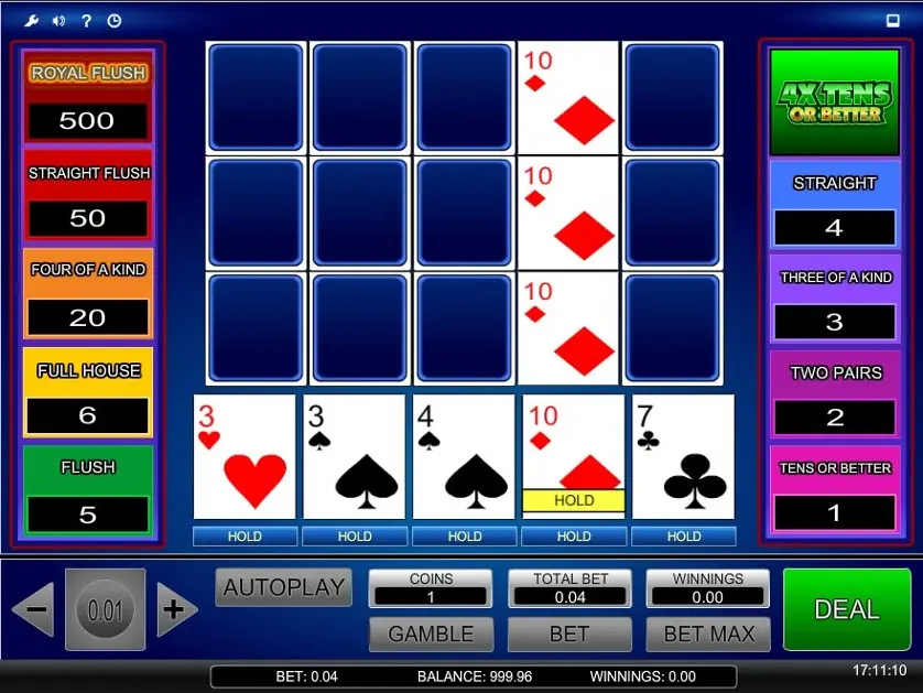 4x Tens or Better è un gioco di video poker di iSoftBet. Qui sopra, puoi giocare gratis in modalità demo.
