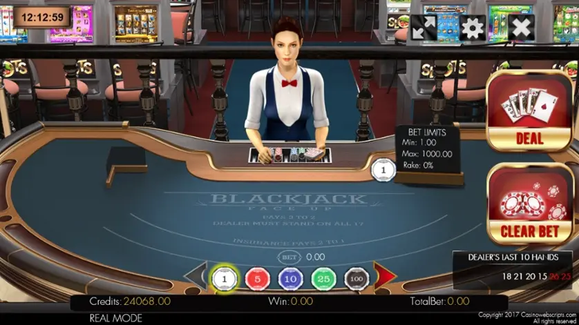 Prova BlackJack 21 FaceUp 3D Dealer online gratis in modalità demo, senza download o registrazione.