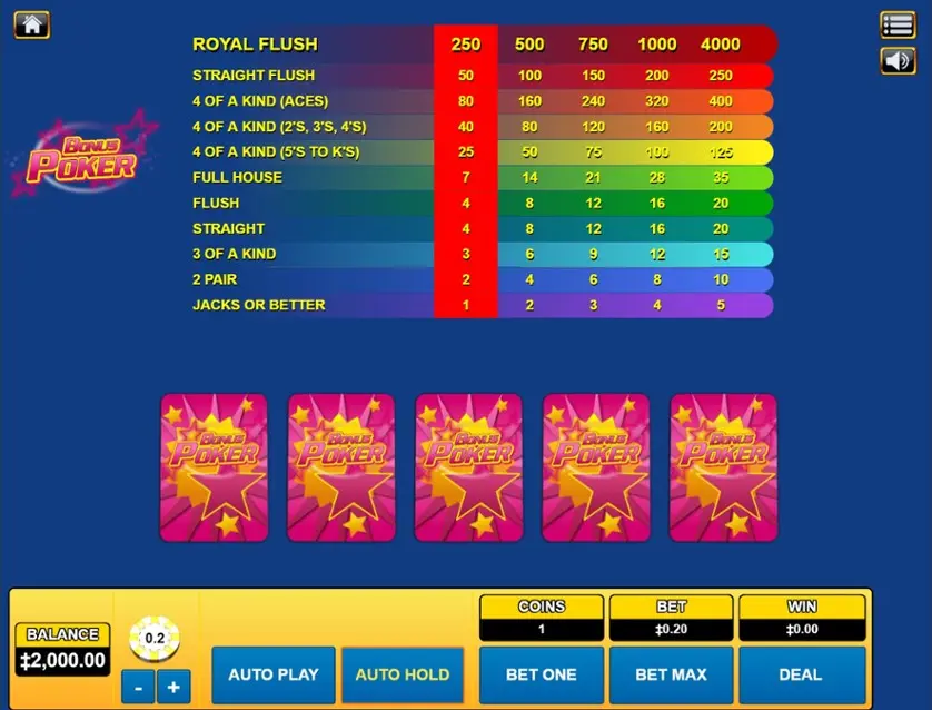 Bonus Poker (Habanero) è un gioco di video poker di Habanero. Qui sopra, puoi giocare gratis in modalità demo.
