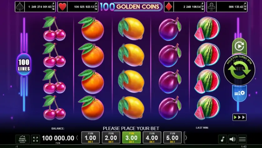 Prova la slot online 100 Golden Coins gratis in modalità demo, senza download o registrazione.