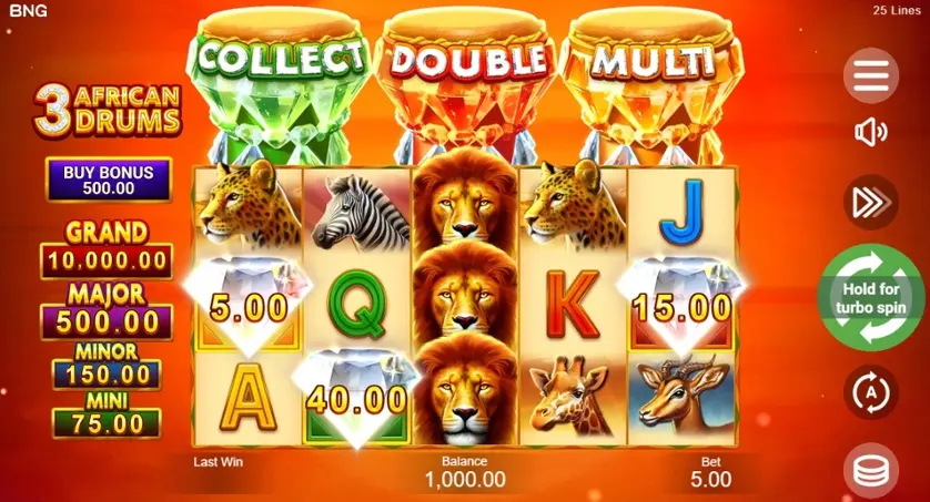 Prova la slot online 3 African Drums gratis in modalità demo, senza download o registrazione.