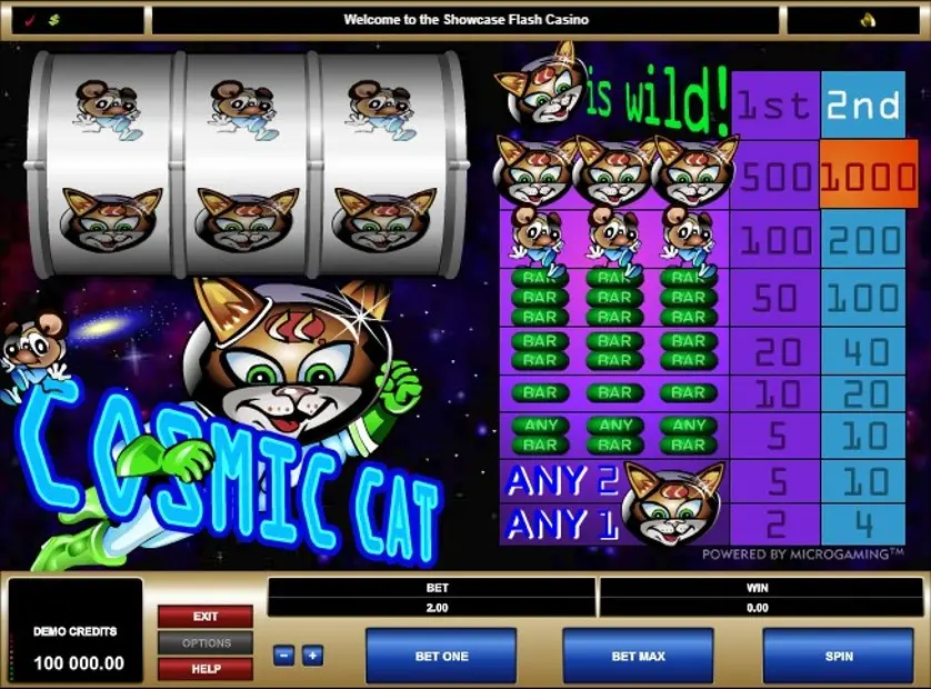 Cosmic Cat è una slot machine creata da Apricot (Microgaming). In base al numero di giocatori che la cercano, Cosmic Cat non è una slot molto popolare. Questo, però, non significa necessariamente che sia una cattiva slot: provala e decidi tu, oppure esplora i giochi da casinò più popolari.