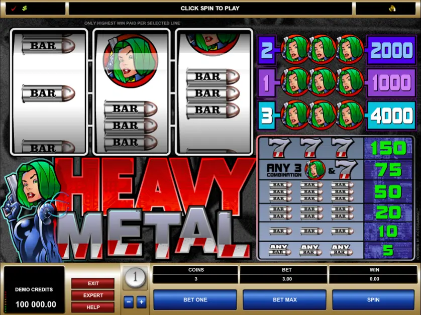 Heavy Metal è una slot machine creata da Apricot (Microgaming). In base al numero di giocatori che la cercano, Heavy Metal non è una slot molto popolare. Questo, però, non significa necessariamente che sia una cattiva slot: provala e decidi tu, oppure esplora i giochi da casinò più popolari.