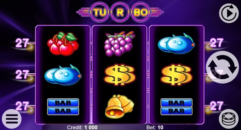 Turbo 27 è l’ennesima slot del genere "slot machine con frutti per il 21° secolo", con una semplice griglia 3 x 3 e 27 linee di vincita (una per ciascuna combinazione di tre simboli, da sinistra verso destra):