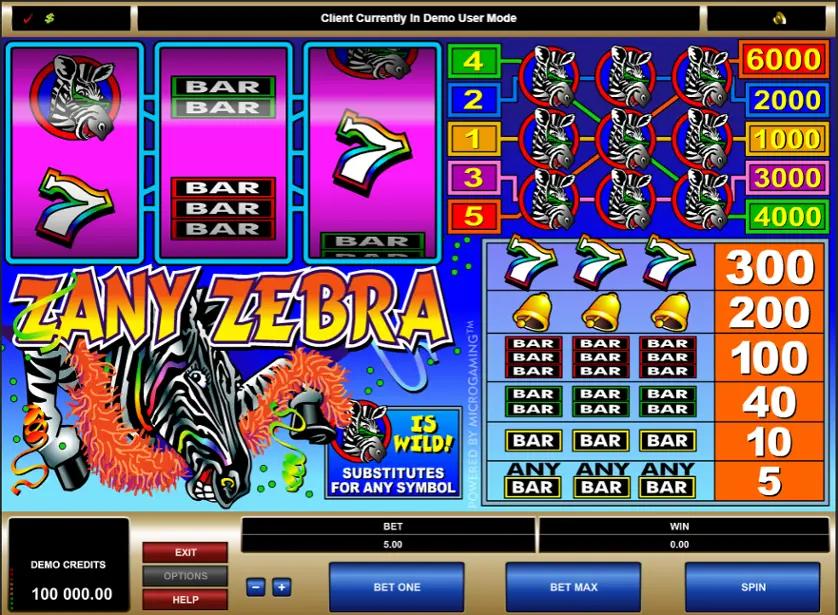 Zany Zebra è una slot machine creata da Apricot (Microgaming). In base al numero di giocatori che la cercano, Zany Zebra è una slot abbastanza popolare. Non è fra i titoli più conosciuti, ma ha catturato l'attenzione di alcuni giocatori di slot. Provala gratis per decidere se ti piace.