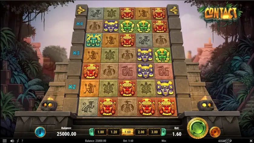 In Contact, i geroglifici a blocchi e le piramidi azteche dagli infiniti gradini sono rielaborati in una slot dotata di uno splendido modello a cascata, con il supporto di rappresentazioni stilizzate di giungle e di ziqqurat sacrificali. Una rappresentazione ricca di atmosfera, che rievoca i momenti iniziali del film ‘I predatori dell’arca perduta’ del 1981.