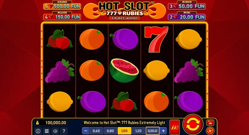 Prova la slot online Hot Slot: 777 Rubies Extremely Light gratis in modalità demo, senza download o registrazione.