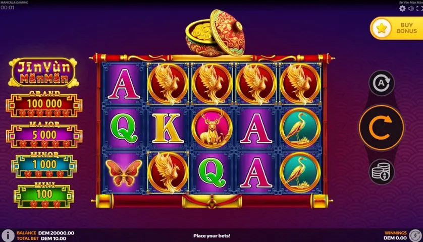 Jīn Yùn Mǎn Mǎn è una slot machine creata da Mancala Gaming. In base al numero di giocatori che la cercano, Jīn Yùn Mǎn Mǎn non è una slot molto popolare. Questo, però, non significa necessariamente che sia una cattiva slot: provala e decidi tu, oppure esplora i giochi da casinò più popolari.