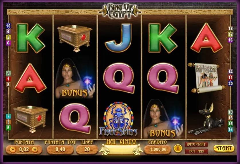 King of Egypt è una slot machine creata da Giocaonline. In base al numero di giocatori che la cercano, King of Egypt non è una slot molto popolare. Questo, però, non significa necessariamente che sia una cattiva slot: provala e decidi tu, oppure esplora i giochi da casinò più popolari.