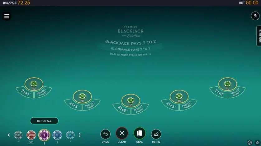 Prova Premier Blackjack with Side Bets online gratis in modalità demo, senza download o registrazione.