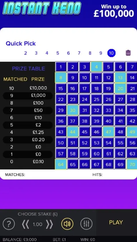 Prova Instant Keno online gratis in modalità demo, senza download o registrazione.