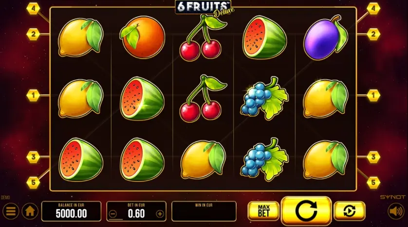 Prova la slot online 6 Fruits Deluxe gratis in modalità demo, senza download o registrazione.