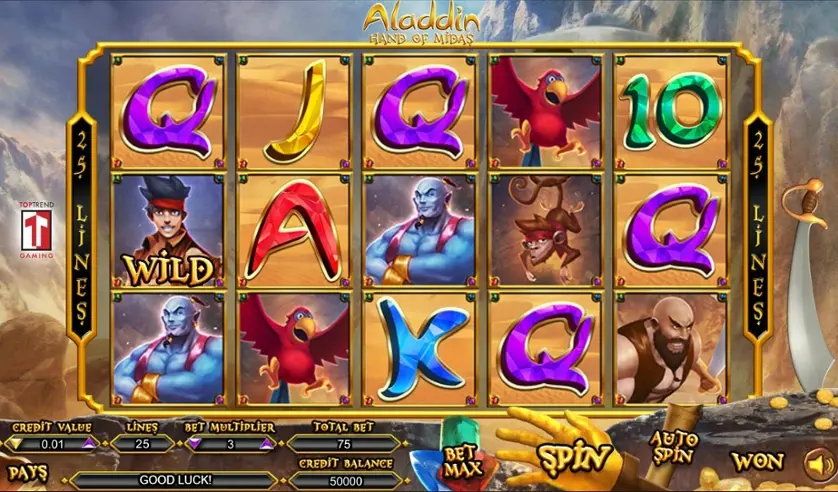 Aladdin Hand of Midas è una slot machine creata da TOPTrend Gaming. In base al numero di giocatori che la cercano, Aladdin Hand of Midas non è una slot molto popolare. Questo, però, non significa necessariamente che sia una cattiva slot: provala e decidi tu, oppure esplora i giochi da casinò più popolari.