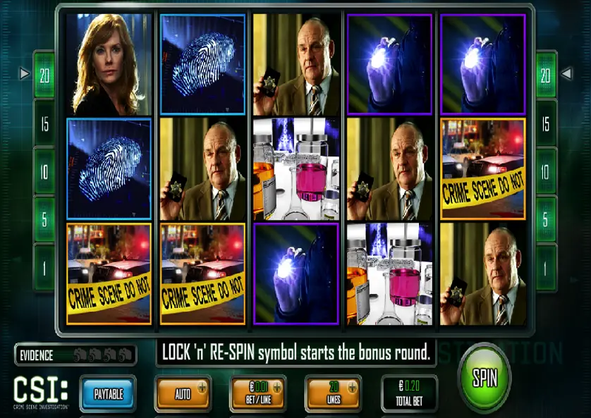 CSI: Crime Scene Investigation è durato 15 stagioni e ne sono state creati tre serie spin-off. La slot machine utilizza il cast delle ultime stagioni, nelle quali Ted Danson è il protagonista.