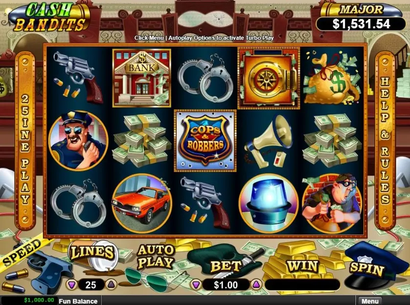 Cash Bandits è una slot machine creata da Realtime Gaming. In base al numero di giocatori che la cercano, Cash Bandits è una slot abbastanza popolare. Non è fra i titoli più conosciuti, ma ha catturato l'attenzione di alcuni giocatori di slot. Provala gratis per decidere se ti piace.