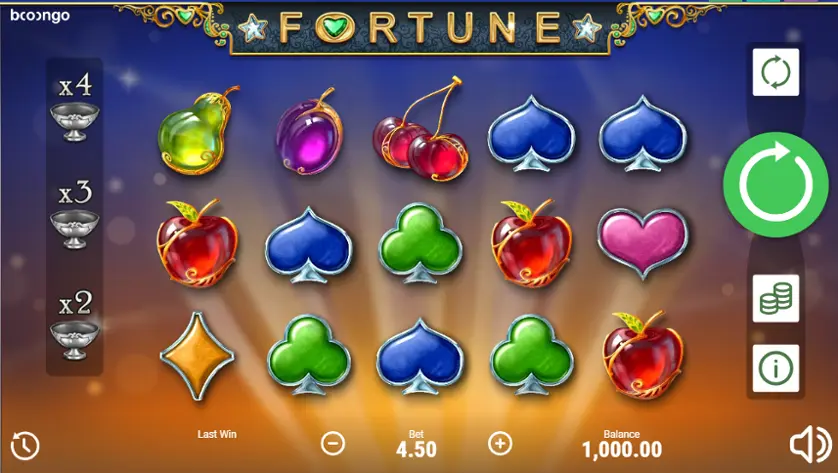 Fortune Multiplier è una slot machine creata da Booongo (BNG). In base al numero di giocatori che la cercano, Fortune Multiplier non è una slot molto popolare. Questo, però, non significa necessariamente che sia una cattiva slot: provala e decidi tu, oppure esplora i giochi da casinò più popolari.