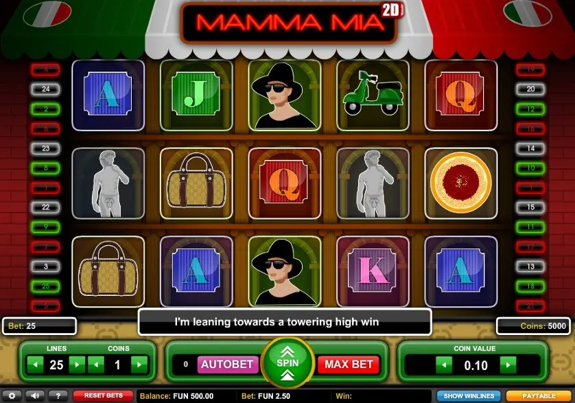 Mamma Mia è una slot machine creata da 1X2 Network. In base al numero di giocatori che la cercano, Mamma Mia non è una slot molto popolare. Questo, però, non significa necessariamente che sia una cattiva slot: provala e decidi tu, oppure esplora i giochi da casinò più popolari.