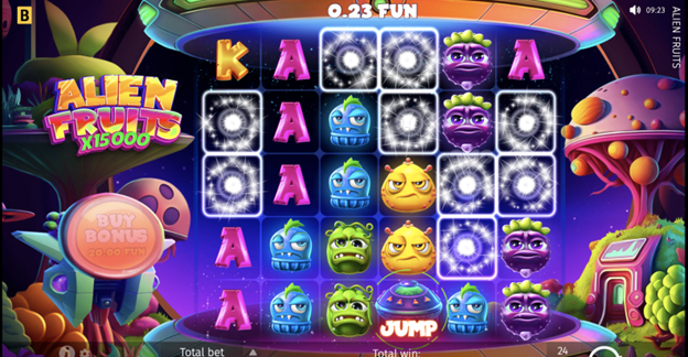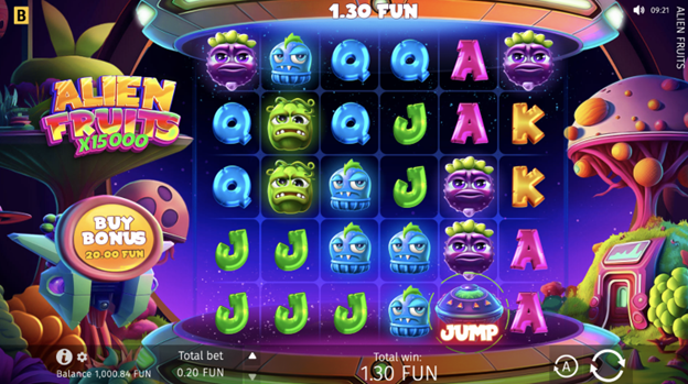Alien Fruits è un gioco di slot a tema spazio cosmico con sei rulli e cinque file di gioco. Offre un RTP del 95,97% e la possibilità di vincere un generoso importo pari a 15.000 volte la puntata.