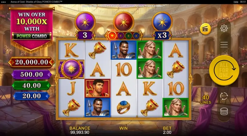 Prova la slot online Arena of Gold: Shields of Glory Power Combo gratis in modalità demo, senza download o registrazione.