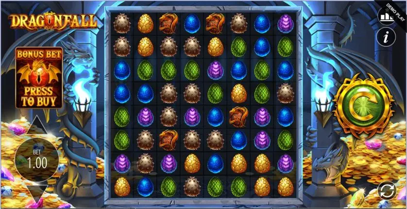 Dragonfall si svolge su un griglia otto per otto. I simboli cadono dall’alto e la presenza di almeno cinque simboli uguali connessi tra di loro, verticalmente e/od orizzontalmente, determina un cluster vincente. Più sono i simboli presenti in un cluster vincente, più elevata è la vincita.