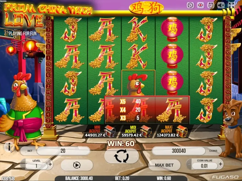 From China With Love è una slot machine creata da Fugaso. In base al numero di giocatori che la cercano, From China With Love non è una slot molto popolare. Questo, però, non significa necessariamente che sia una cattiva slot: provala e decidi tu, oppure esplora i giochi da casinò più popolari.