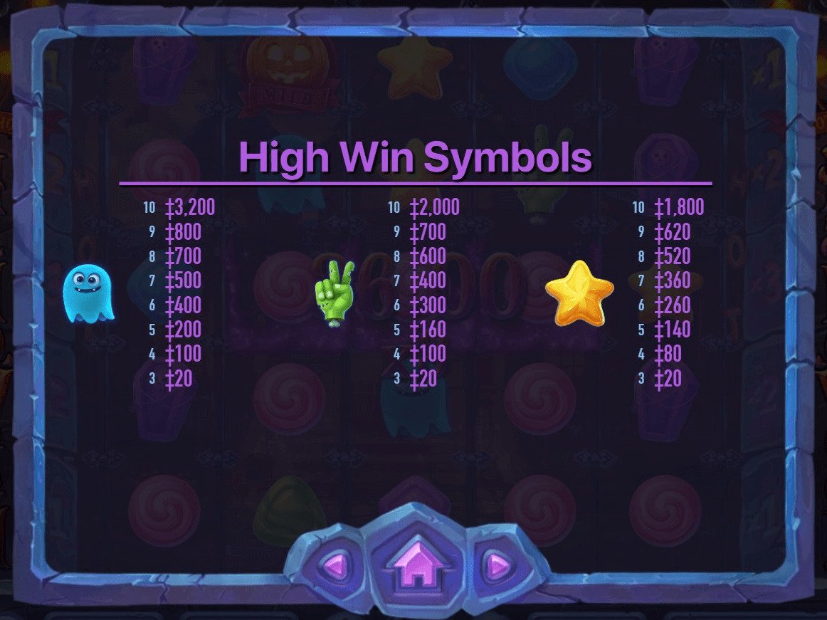 Il simbolo più redditizio è il sette, seguito dalla bara viola e dal gocciolante bulbo oculare rosa. Si ottengono vincite inferiori quando appaiono forme coloratissime, quali il triangolo verde e il cerchio rosa.