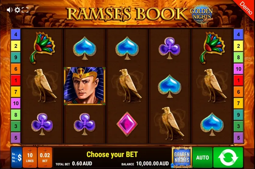 Prova la slot online Ramses Book - Golden Nights Bonus gratis in modalità demo, senza download o registrazione.