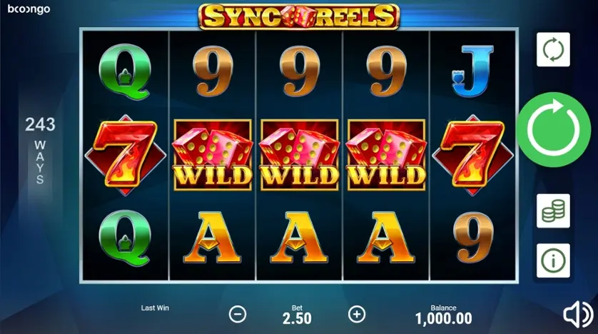 Sync Reels è una slot machine creata da Booongo (BNG). In base al numero di giocatori che la cercano, Sync Reels non è una slot molto popolare. Questo, però, non significa necessariamente che sia una cattiva slot: provala e decidi tu, oppure esplora i giochi da casinò più popolari.