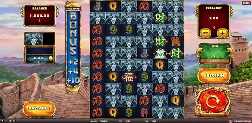 Le creature presenti già nel nome della slot Tiger and Dragon sono i più grossi predatori dello zodiaco cinese, ma non fanno quasi nessuna comparsa sui rulli. Ci si trova davanti, invece, sullo sfondo della Grande Muraglia, un imponente set di rulli molto interessanti, con molti posti vuoti.