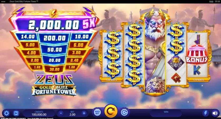 Prova la slot online Zeus Gold Blitz Fortune Tower gratis in modalità demo, senza download o registrazione.