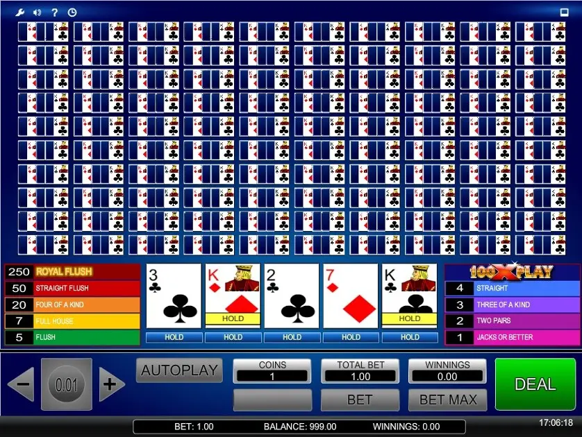100x Play è un gioco di video poker di iSoftBet. Qui sopra, puoi giocare gratis in modalità demo.