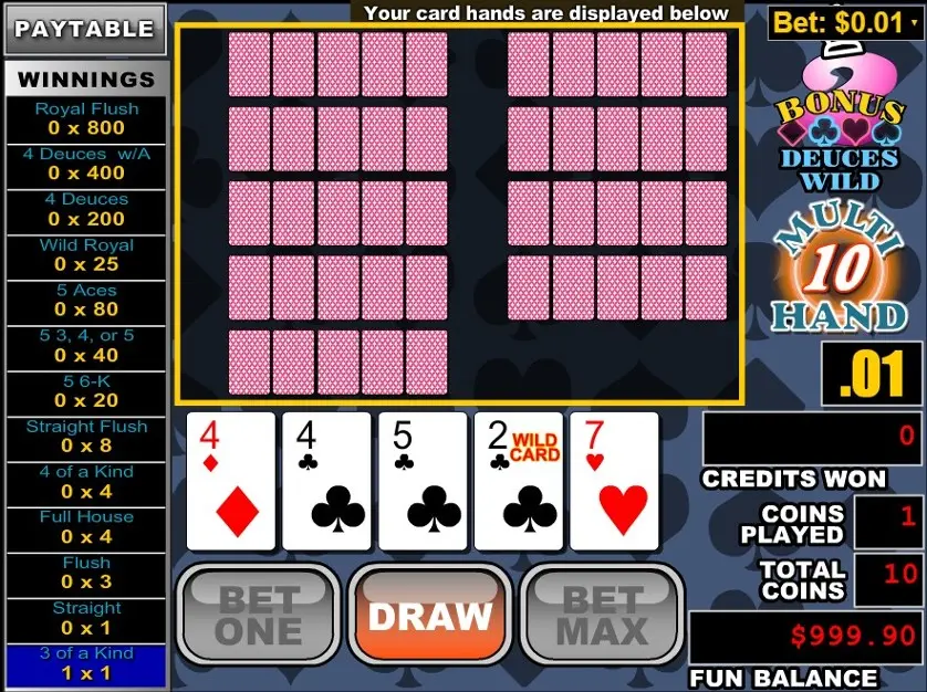 Prova Bonus Deuces Wild - 10 Hands online gratis in modalità demo, senza download o registrazione.