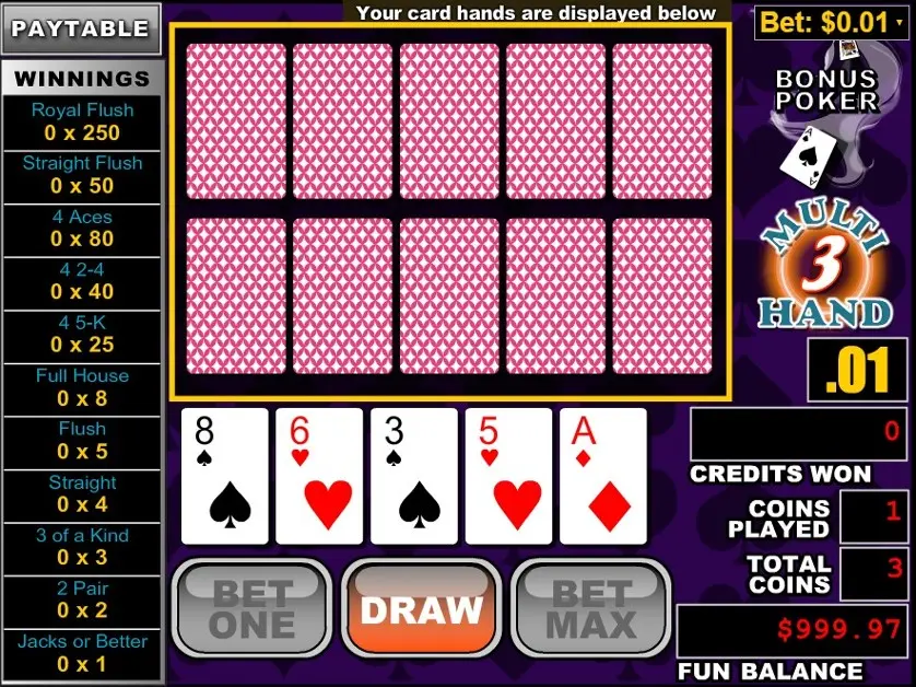 Prova Bonus Poker - 3 Hands online gratis in modalità demo, senza download o registrazione.