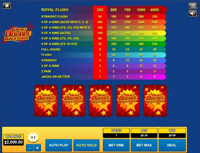 Double Double Bonus è un gioco di video poker di Habanero. Qui sopra, puoi giocare gratis in modalità demo.