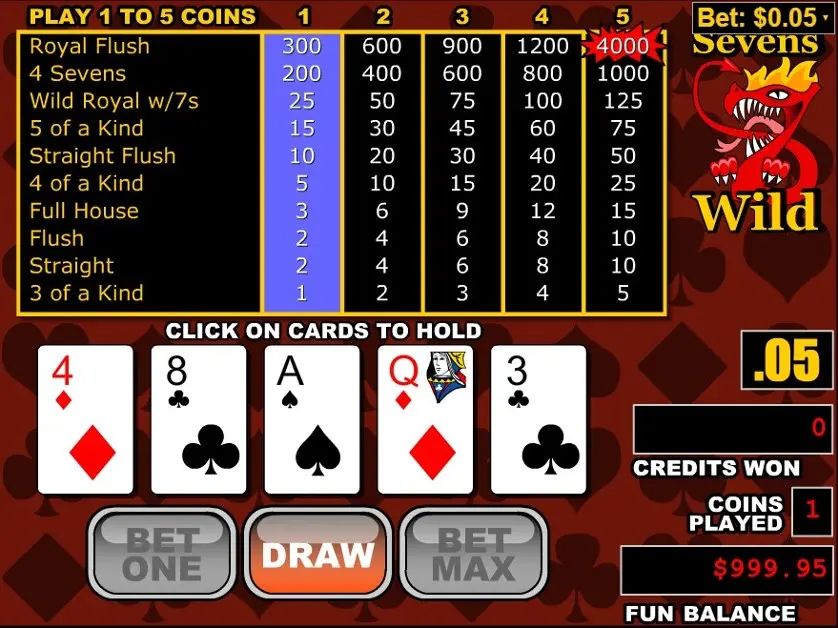 Sevens Wild è un gioco di video poker di Realtime Gaming. Qui sopra, puoi giocare gratis in modalità demo.