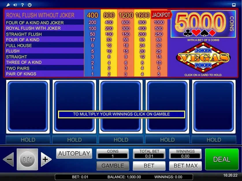 Prova Vegas Joker Poker online gratis in modalità demo, senza download o registrazione.