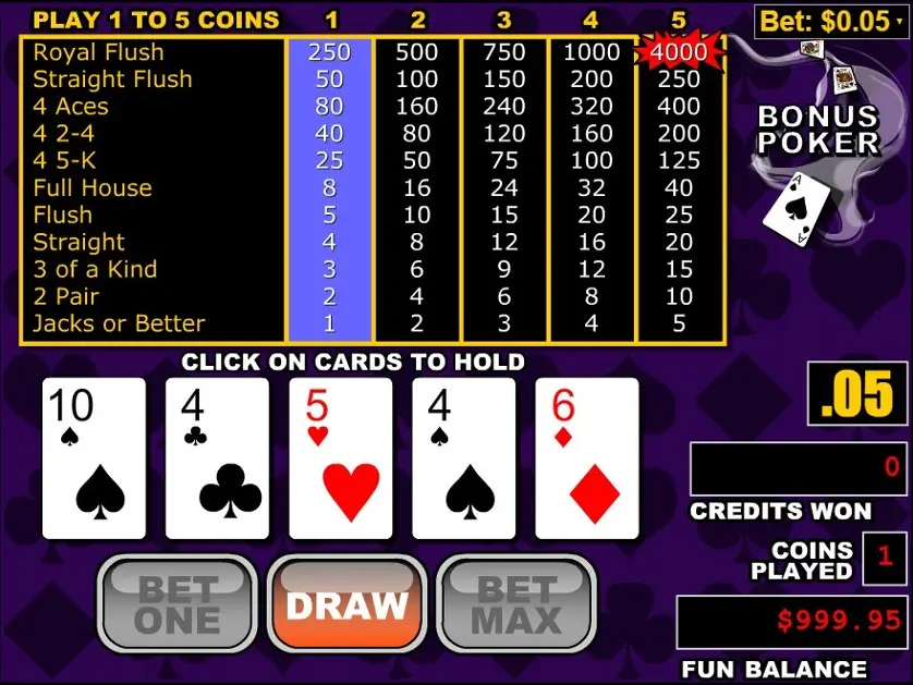 Bonus Poker (RTG) è un gioco di video poker di Realtime Gaming. Qui sopra, puoi giocare gratis in modalità demo.