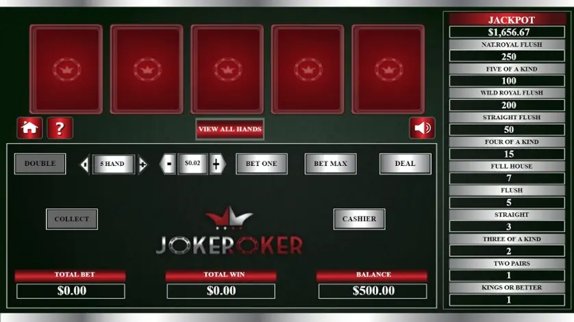 Joker Poker (Five Hand) è un gioco di video poker di Arrow's Edge. Qui sopra, puoi giocare gratis in modalità demo.