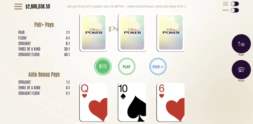 Three Card Poker è un gioco di video poker di FlipLuck Games. Qui sopra, puoi giocare gratis in modalità demo.