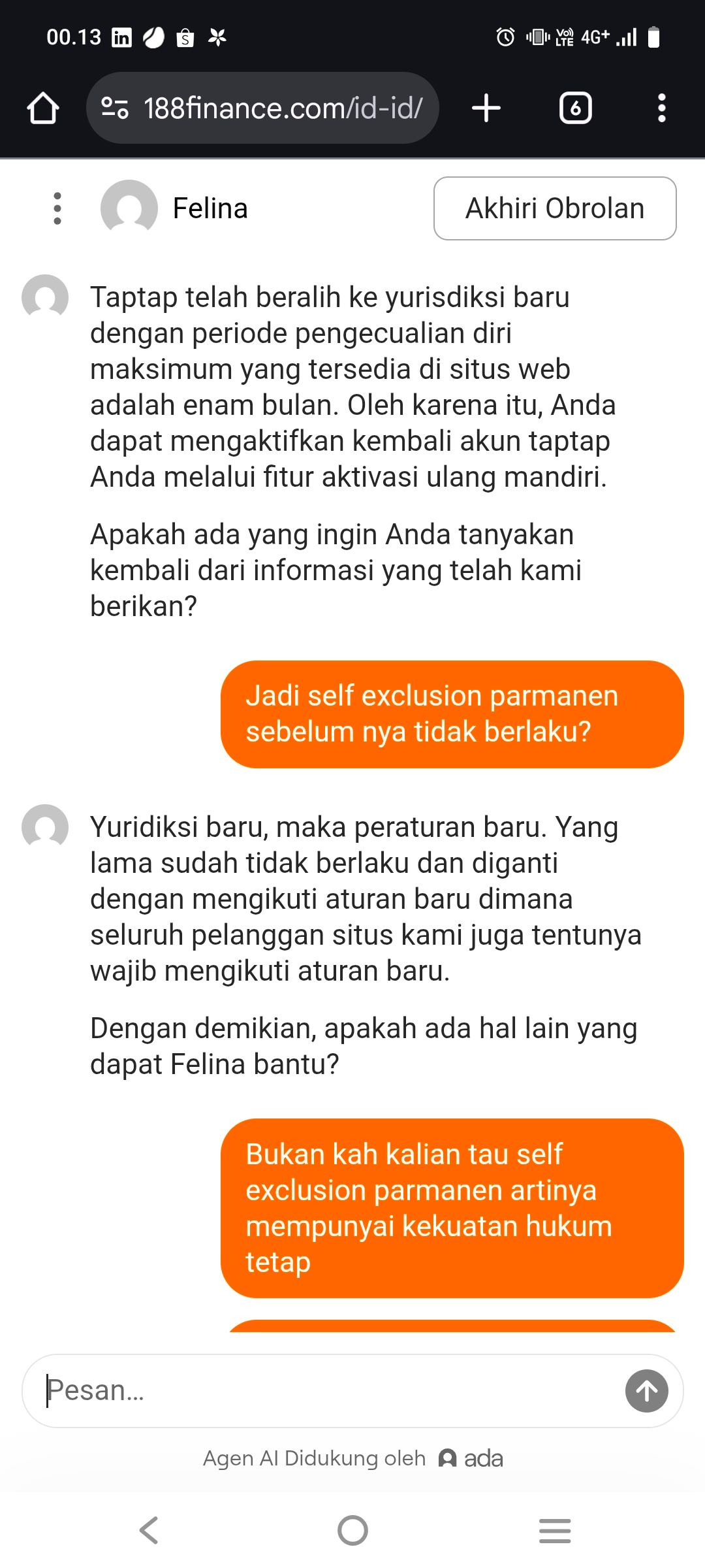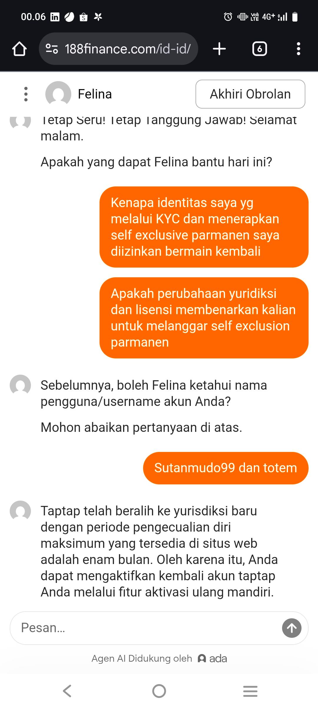 Il giocatore indonesiano ha presentato un reclamo in merito alla mancata applicazione da parte di Bet188 della sua autoesclusione permanente, che gli aveva consentito di continuare a giocare e depositare 100.200 €. Questa violazione del gioco responsabile gli ha causato un notevole disagio finanziario ed emotivo. Ha richiesto un'indagine, il rimborso completo dei suoi depositi, un risarcimento e garanzie che la sua autoesclusione sarebbe stata correttamente applicata. La questione è stata risolta dal Team Reclami, che ha dichiarato che il reclamo è stato respinto a causa dell'incapacità del giocatore di fornire le prove necessarie per la sua richiesta di autoesclusione, essenziali per verificare la sua richiesta.